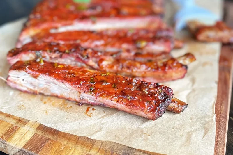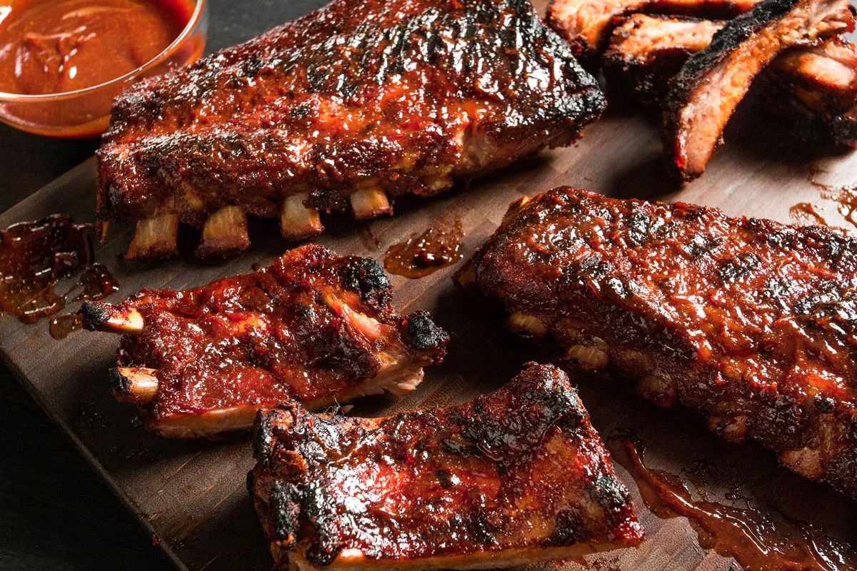 Oak-grilled pork ribs glazed with our homemade cilantro garlic bbq sauce