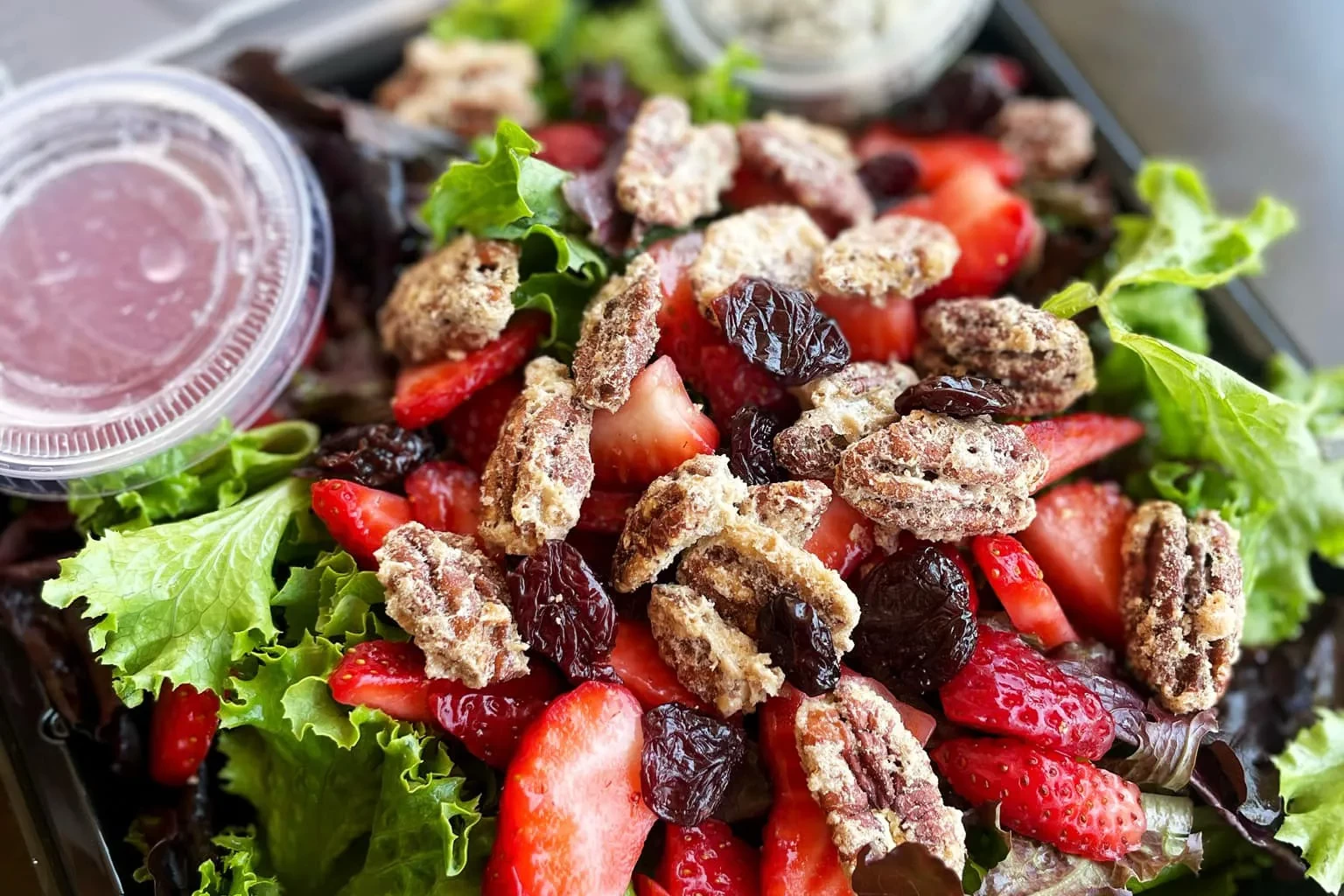 Locally farmed mixed greens topped with crumbled Feta cheese, fresh strawberries, candied pecans, and dried cherries. Served with a blush wine vinaigrette dressing.