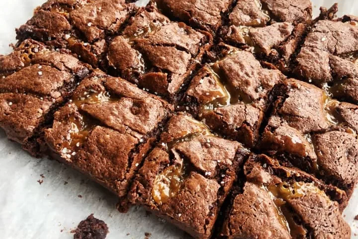 A triple-chocolate brownie drizzled with gooey caramel and sprinkled with sea salt. || Vegetarian • Contains dairy, gluten